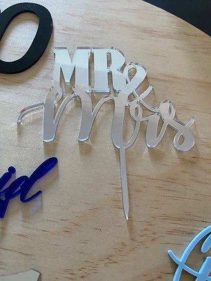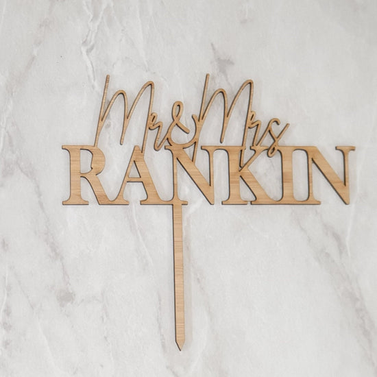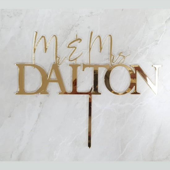 Personalised custom name wedding cake topper made to order with quality materials in acrylic, mirror acrylic and woods such as bamboo or ply wood.